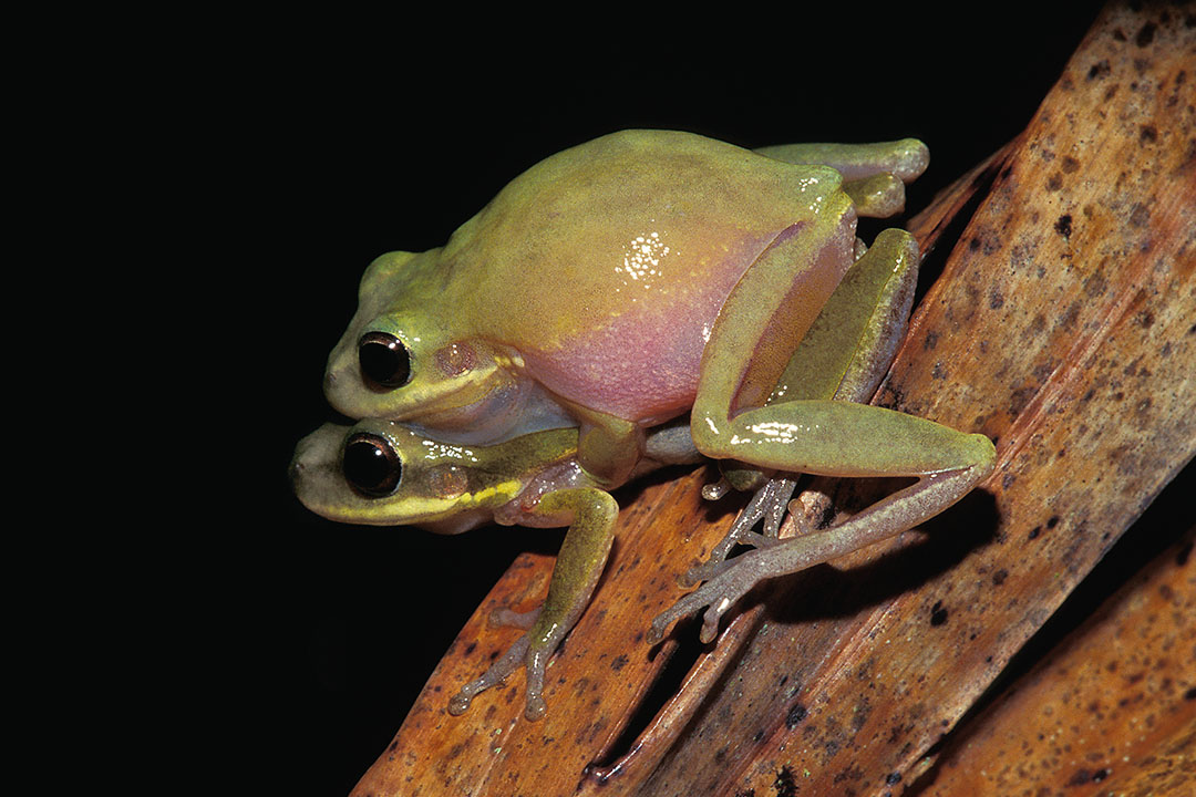 Behavior: Squirrel Treefrogs are mainly explosive summer breeders that form large choruses lasting only a night or two. The males congregate and call excitedly from temporary ponds, pools, and roadside ditches. (In many cases, however, these bodies of water dry out before the tadpoles have a chance to transform.) Even when there has been little rain, isolated males may be heard calling in the shallow parts of semipermanent and permanent ponds. Satellite behavior (LINK GOES HERE p. 24) is common, and a large male may have several satellites positioned near him, all attempting to intercept females that are attracted to his loud calls.